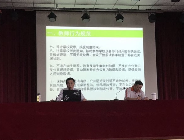 8月25日下午,全校教师在报告厅听取了王支和副校长所作的班主任工作和学生管理的规章制度的专题报告,王副校长重点解读了班主任职责、班主任绩效考核,学生一日常规及违纪处理办法等,并结合案例提出了具体要求。
